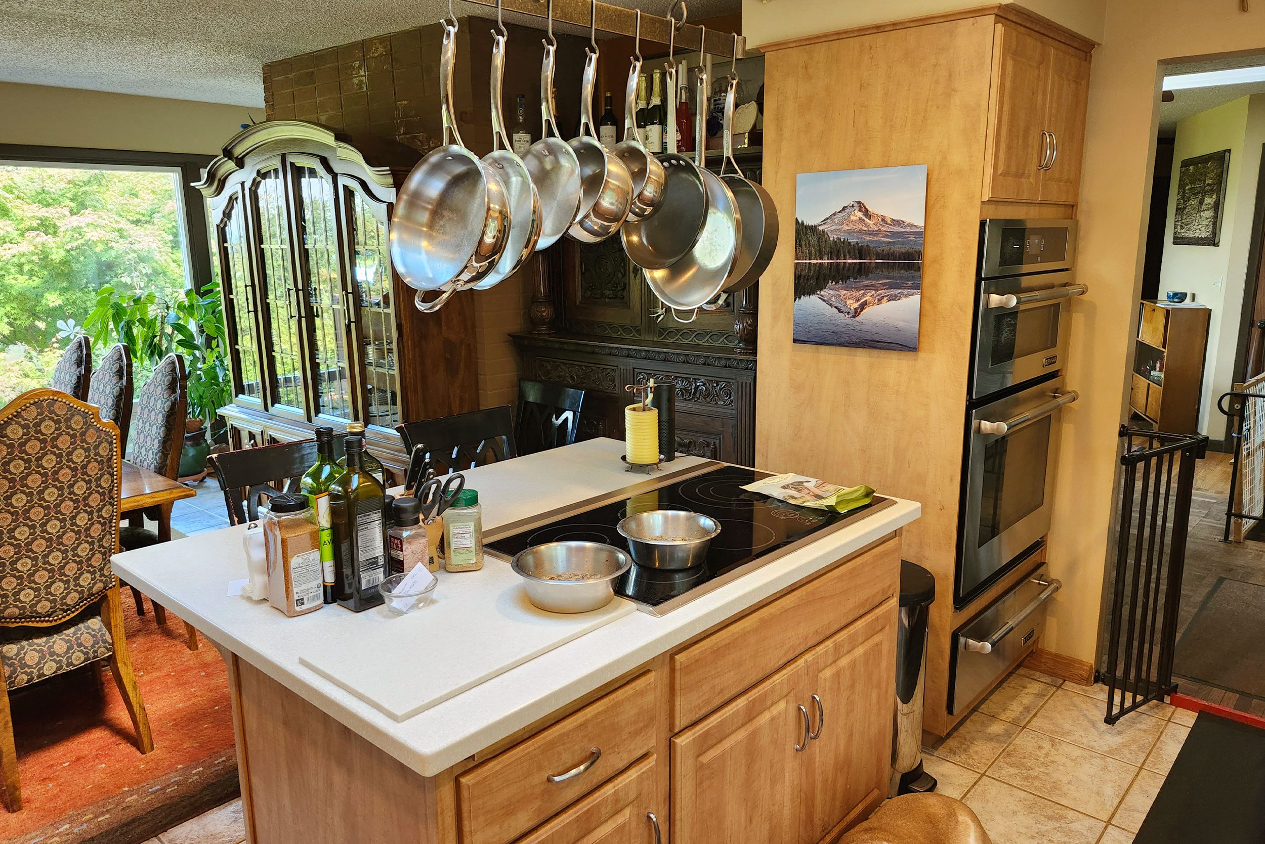 There was no comparison after the remodel was finished. Light and bright quartz counters compliment the natural wood tones throughout while the matching stained alder fireplace panel wrap is installed on the kitchen side to tie the dining and kitchen spaces together.