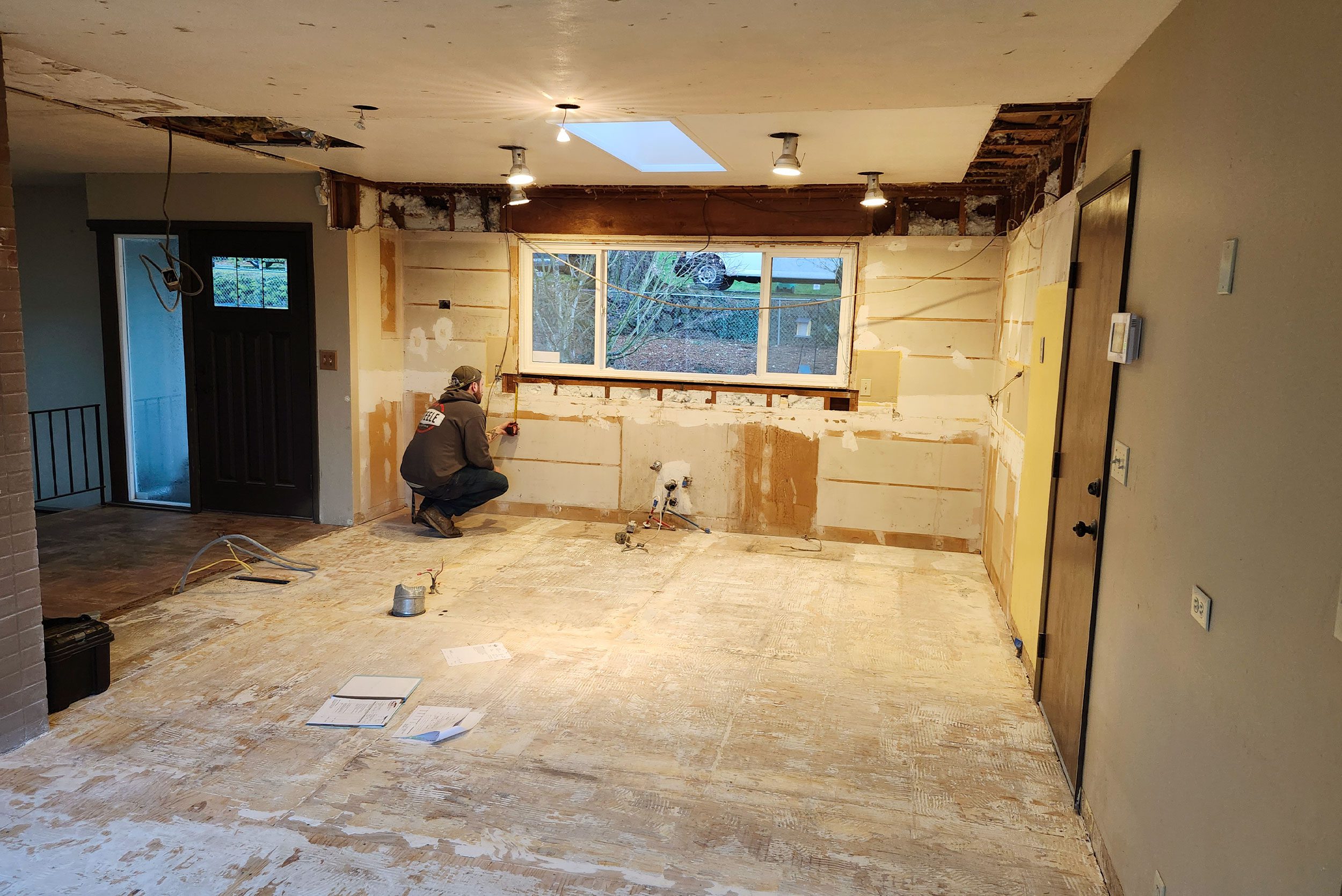 Here is a view of this 1960s home before the arrival of NW Residential. There was a small kitchen with a dividing wall to the living room. We also show the reverse view from the living room to kitchen and dining room. It was time to get to work, starting with a gutted kitchen and removal of the dividing wall and soffits. The new open floor plan is coming together during the drywall stage of the remodel.