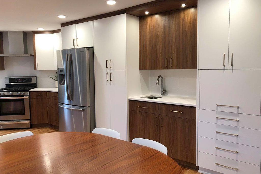 The kitchen underwent a complete transformation, evolving from a traditional layout into a modern, highly functional space. The new design features a combination of warm wood cabinetry and clean white upper cabinets, creating a balanced and timeless look.