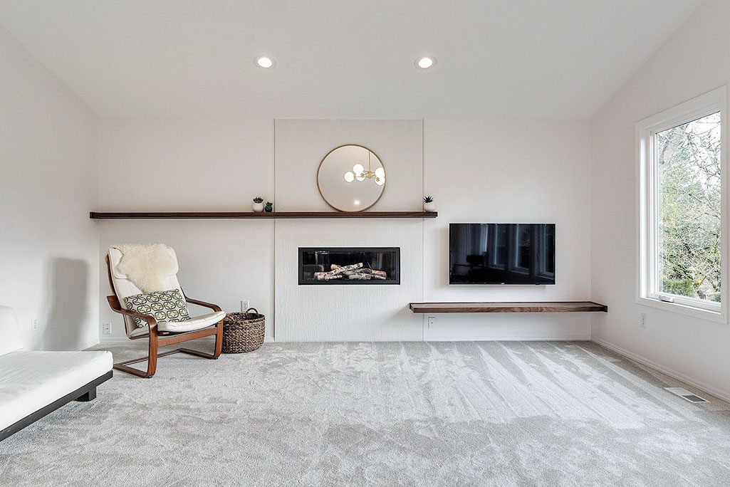 The adjacent living room was updated to complement the new kitchen layout, creating a cohesive and comfortable environment. Clean lines, neutral tones, and updated finishes contribute to a bright and welcoming space that feels both modern and timeless.